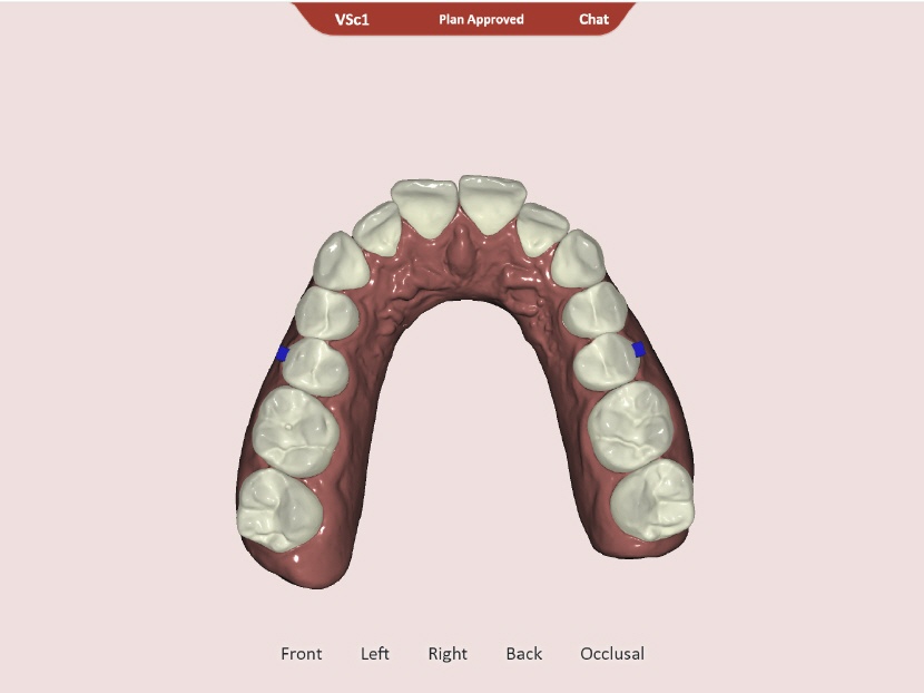 Die Behandlung (13 Steps im Ober- und Unterkiefer) dauerte vom April bis Dezember 2022. Der Zahnbogen entspricht der Simulation.