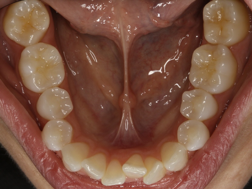 Unharmonischer Zahnbogen, minimaler Frontengstand.