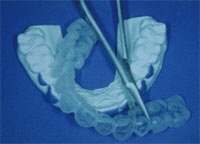 Das Zahnfleich wird mit einer Maske abgedeckt und anschliessend werden die Zähne während 3-4 Zyklen a 15 Minuten mit Gel beschickt und mit einer Speziallampe (Philips Zoom) wird das Gel aktiviert.