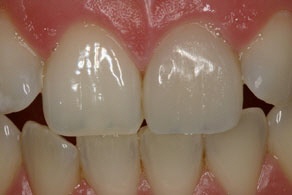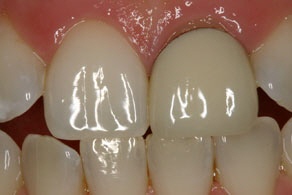 Der Techniker hat die Krone (Feldspat, Vita MK II) nachträglich minimal reduziert und mit Vita VM9 Keramikmasse (ebenfalls Feldspat) individualisiert. Damit erhält die monochrome (einfarbige) Krone eine nätürliche Transluzenz (bläulich-gräulicher Schneidekantenbereich) und ist von dem nätürlichen Zahn kaum zu unterscheiden.