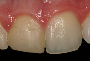 Die linke zentrale Schaufel (rechts im Bild) ist mit einer Verbund-Metall-Keramik Krone versorgt. Das heisst die Krone besitzt ein Metallgerüst (meist eine Goldlegierung), welche mit einer schwachen Keramik verblendet wird. Aus technischen Grüden kann das Goldgerüst nicht immer vollständig mit Keramik überzogen werden. Liegt nun dieser feine Goldrand, wie beim vorliegenden Fall, im sichtbaren Bereich, stört dieser dunkle Rand dementsprechend stark und ist ausschlaggebend für den Wunsch nach dem Ersatz der Krone.