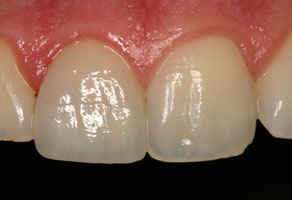 Unter Kofferdam wurde die Krone adhäsiv eingesetzt (geklebt), anschliessend wurde die Zement reste entfernt. Das Zahnfleisch ist auf dem Bild links durch die Rändernachbearbeitung (Politur) noch leicht gerötet, wird sich aber nach 1-3 Tagen erholen. Durch das Bemalen wird eine fast nätürliche Transluzenz erreicht, aber einen "Tiefen-Effekt" wie beim Fall 1 ist nicht möglich. Trotzdem ist die Krone im Alltag (auf normaler Sprechdistanz) nicht als "künstlicher Zahn" zu erkennen.