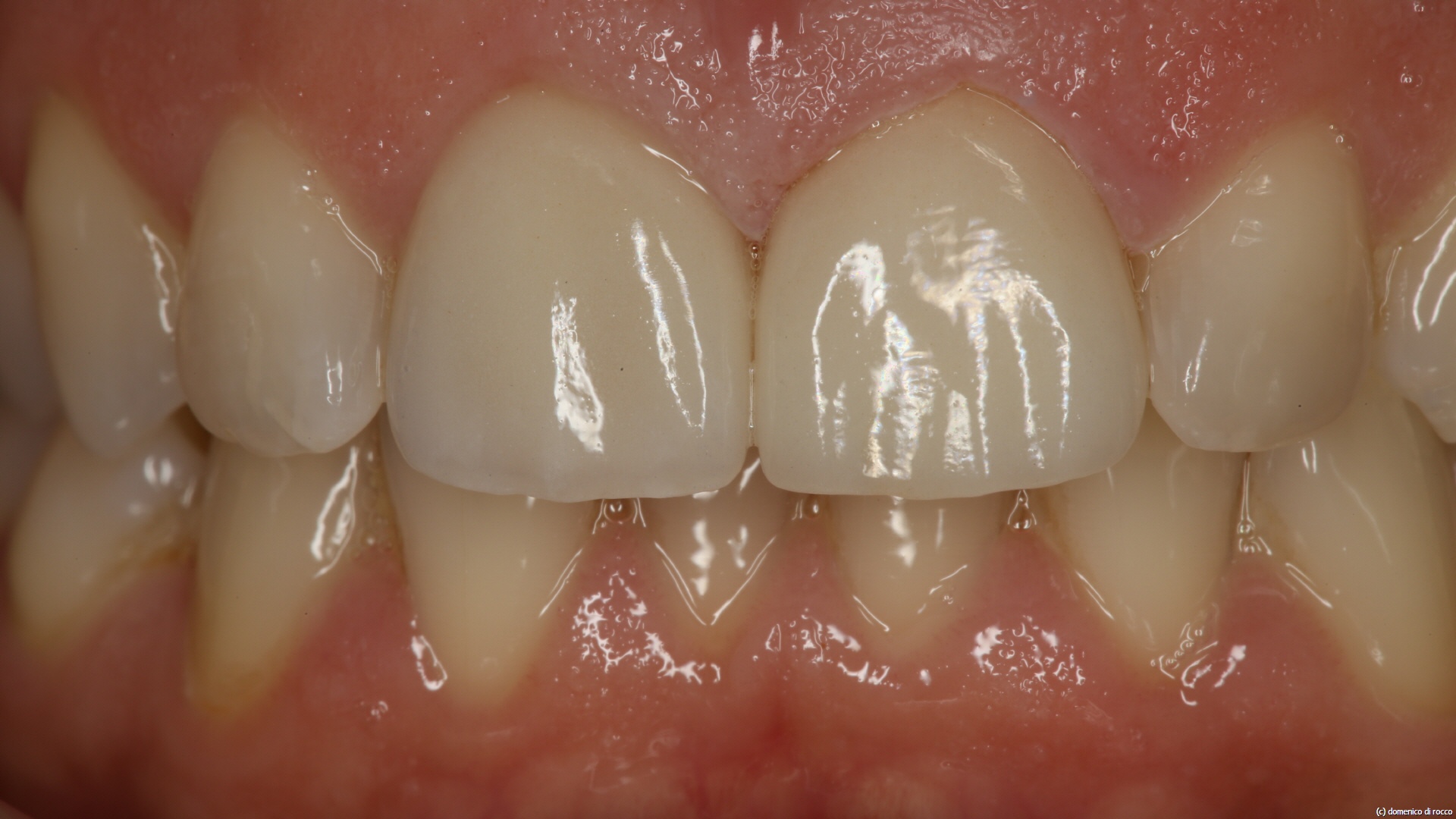 Die rechte zentrale Schaufel (links im Bild) wurde bei einem Skateboard Unfall stark beschädigt und Notfallmässig mit einer Kompositfüllung versorgt. Der Patient störte sich an der Form und Farbe und wünschte eine definitive Versorgung mit Keramik.
