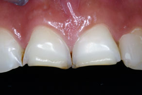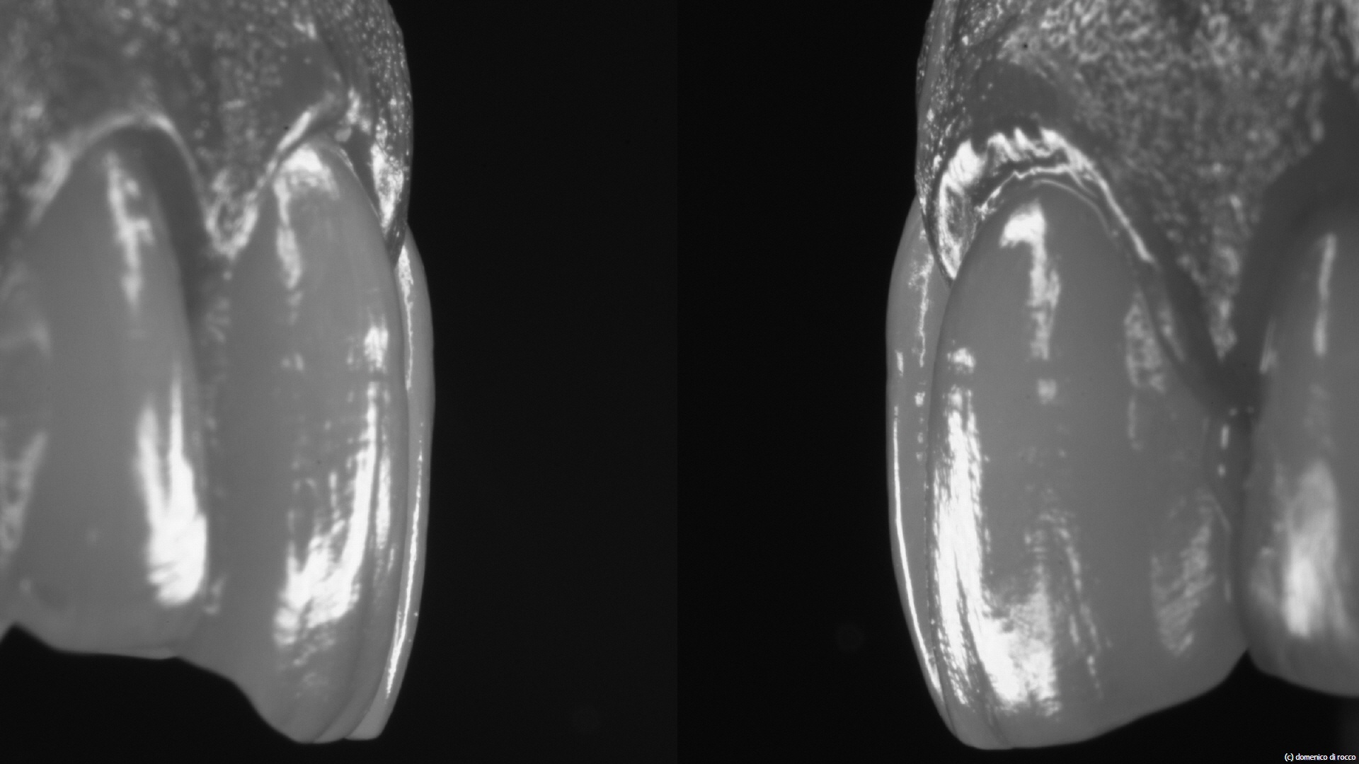 Somit wurden die Zähne wo nötig beschliffen und finiert. Rechts im Bild sehen Sie die finale Situation der präparierten Frontzähne vor der digitalen Abformung. Damit der Rand besser einsehbar ist wird einen Faden (dunkle Linie entlang des Zahnfleischrandes) zwischen Zahn und Zahnfleisch gelegt, der nach der Insertion der Veneers entfernt wird.