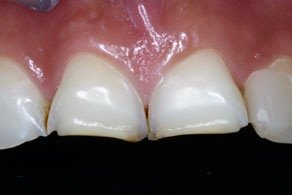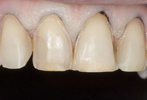 Die Oberkiefer Frontzähne wurden durch einen erhöhten Säurekonsum stark zerstört (Erosionen). Die vier Incisiven (Schneidezähne) werden auf Wunsch der Patientin mit Keramikschalen (Veneers) versorgt. Nach einer präzisen Inspektion und Planung wird mittels Mockup (simuliert die zukünftige Rekonstruktion) entschieden, wo wie viel Platz benötigt wird und nur dort entsprechend Substanz reduziert. Aufgrund der klinischen Situation wurde entschieden, dass die vier Veneers aus einer Glaskeramik hergestellt werden.