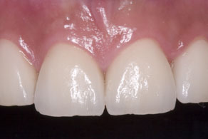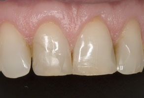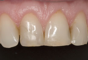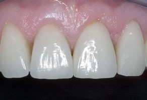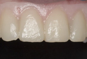 Die vier Veneers wurden aus IPS Empress CAD Multi (A1) Blöcke hergestellt. Nach der Vorpolitur werden die Veneers zur Verbesserung der Ästhetik für einen sogenannten Glanzbrand in den Keramikofen gelegt und nach Vorgabe des Keramikherstellers vergütet. Anschliessend werden die vier Veneers unter absoluter Trockenlegung adhäsiv eingesetzt und poliert. Links das Schlussresultat bei der Nachkontrolle nach einem Monat.