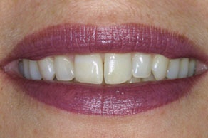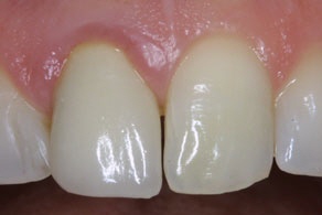 Die rechte zentrale Schaufel (Incisiv) ist mit einer Verbund-Metall-Keramik Krone versorgt. Der Kronenrand liegt leicht subgingival und führt trotz guter Mundhygiene zu einem leicht entzündeten Gingivasaum.